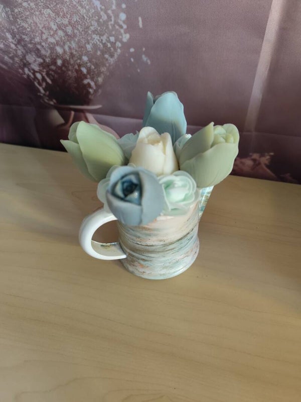 Apportez douceur et poésie à votre intérieur avec cet arrosoir décoratif fait main en jesmonite. Son marbrage unique blanc, vert doré, bleu et ses nuances terracotta en font une véritable pièce d’artisanat. Il est orné de tulipes en fondants parfumés à la fleur de coton, pour une ambiance délicatement fleurie et cocooning.
