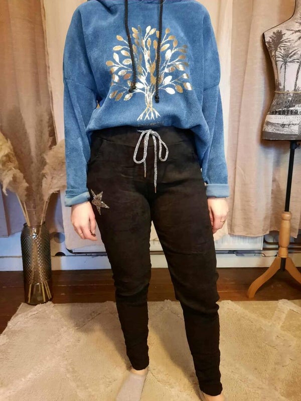 Un pull à capuche doux et tendance, orné d’un magnifique arbre de vie à l’avant. Conçu en mélange de viscose, polyester et élasthanne (60% viscose / 35% polyester / 5% élasthanne), il est confortable et extensible. Taille unique (38 au 44). Plusieurs coloris disponibles. Fabriqué en Italie.