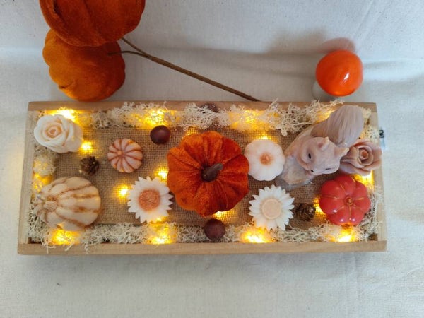 Composé d’une guirlande lumineuse scintillante, de deux bougies parfumées au marron chaud et de fondants parfumés faits main, il est décoré de jolis éléments de saison : citrouilles, fleurs, courge et écureuil 🐿️.
