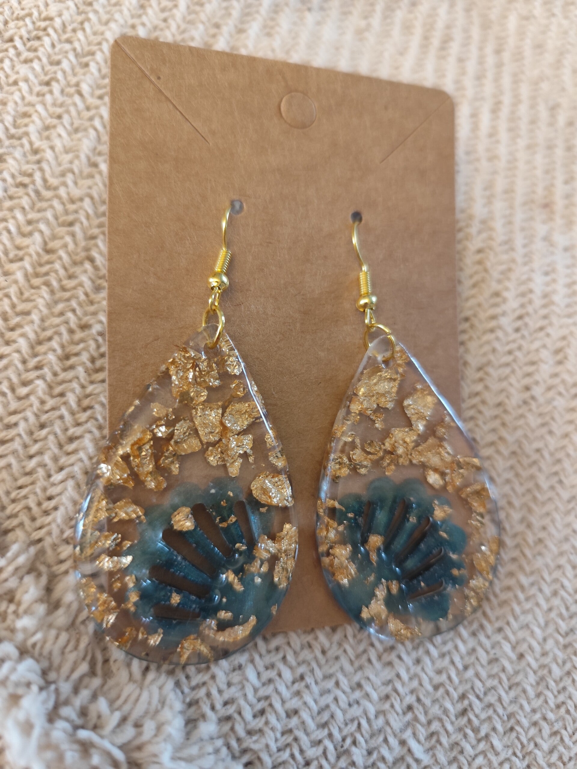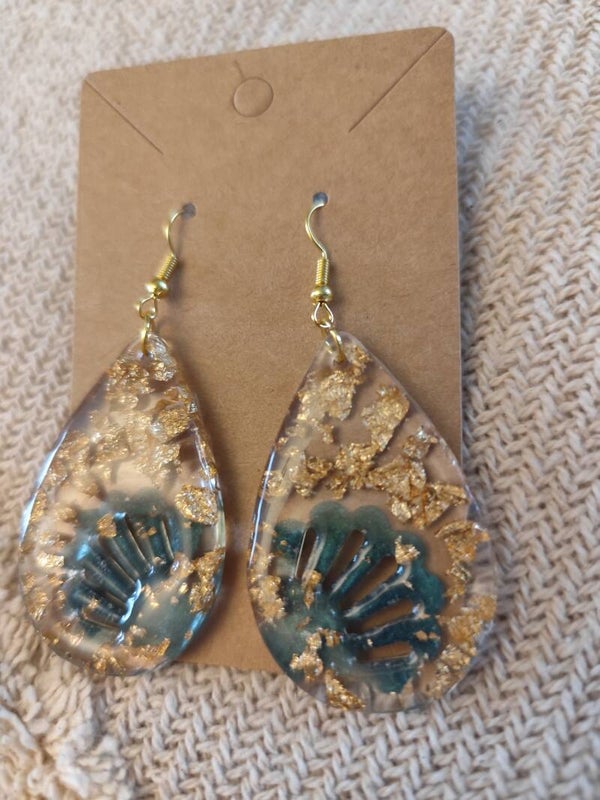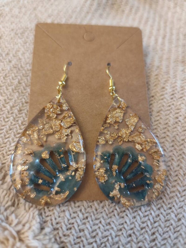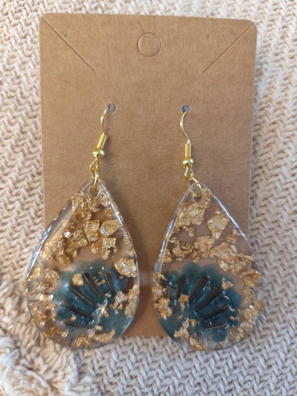 Boucles d’oreilles goutte en résine UV – Feuille d’or & effet vert lagon – Fait main